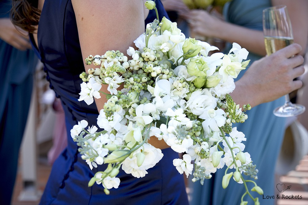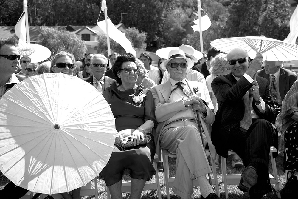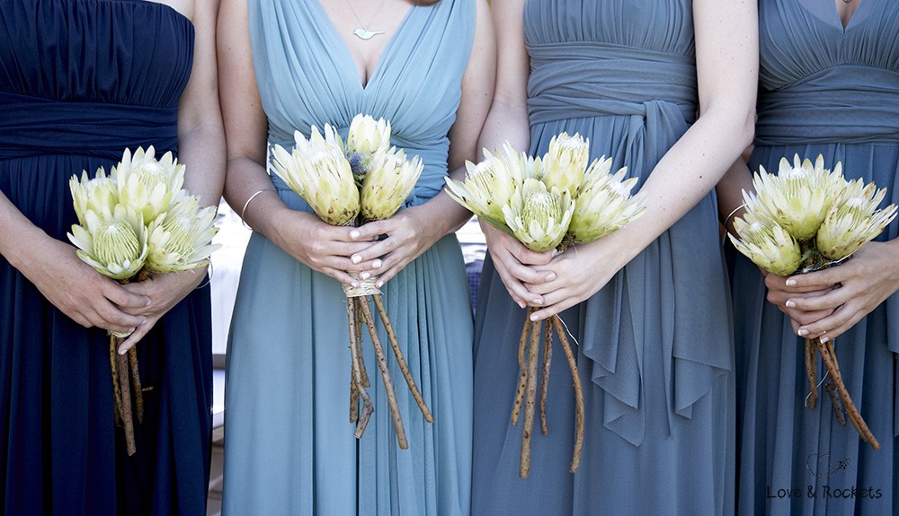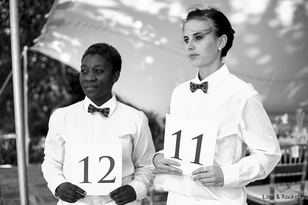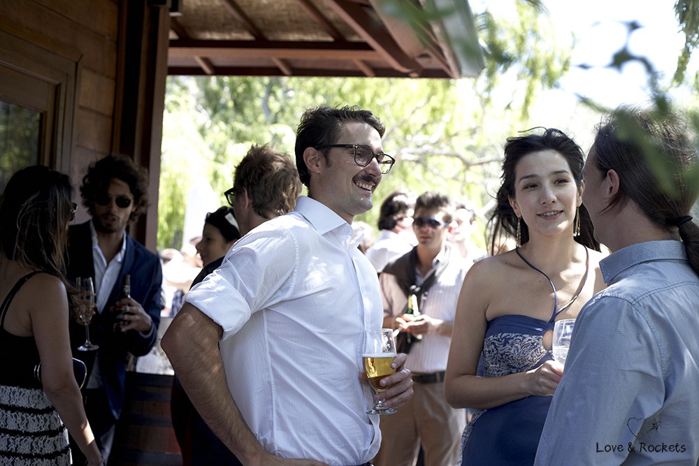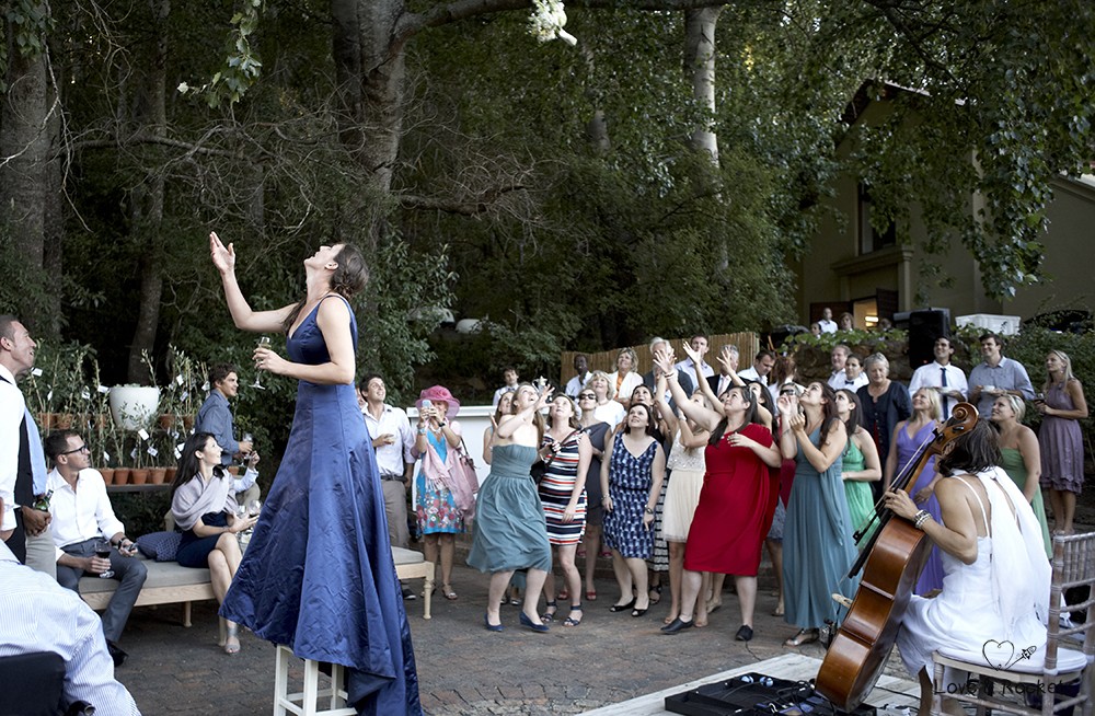 At their wedding they mix tradition in with a few quirky touches. Marieke is wearing an indigo blue dress and blue silk shoes that make her look like a lady but she is full of excitement and laughing away like a child. The reception tables are covered with blue Shweshwe fabric and the guests stroll onto the lawns by the lake in their white hats and paper umbrellas. Its a relaxed afternoon under the African sun at Stark-Conde wine farm thats located in the picturesque Jonkershoek Valley in Stellenbosch.