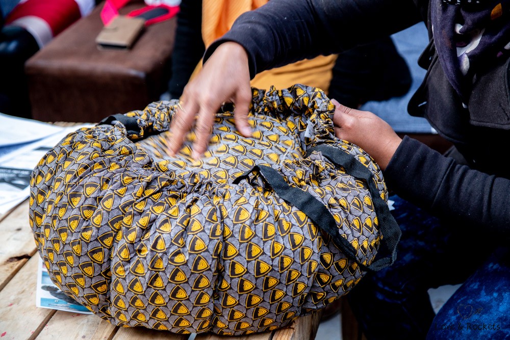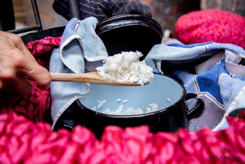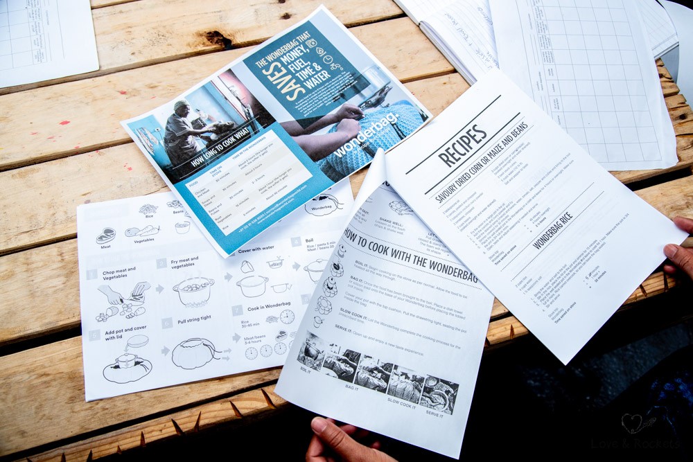 The Wonderbag is a simple, foam insulated slow cooker. After a few minutes of brining the pot of food to boil, the pot is placed into the Wonderbag and left to continue cooking on its own. The bag keeps heat for up to 12 hours and the food can not burn. Because the pot is taken of the stove within few minutes, cooking with Wonderbag reduces by 70% the amount of wood, charcoal, gas and electricity. This system also saves time and labour. Cooking rice conventionally can take up to 30 minutes of stirring and adding extra water. If combining few minutes to bring the pot to boil and then placing it into the Wonderbag for an additional 30min, the rice will be cooked within 45minutes on its own. This process will save considerable amount of water, time and fuel. The food can be cooked over night and ready for breakfast meals, leaving more time to prepare the second meal of the day, making life time efficient and affordable for the volunteers feeding the communities.
